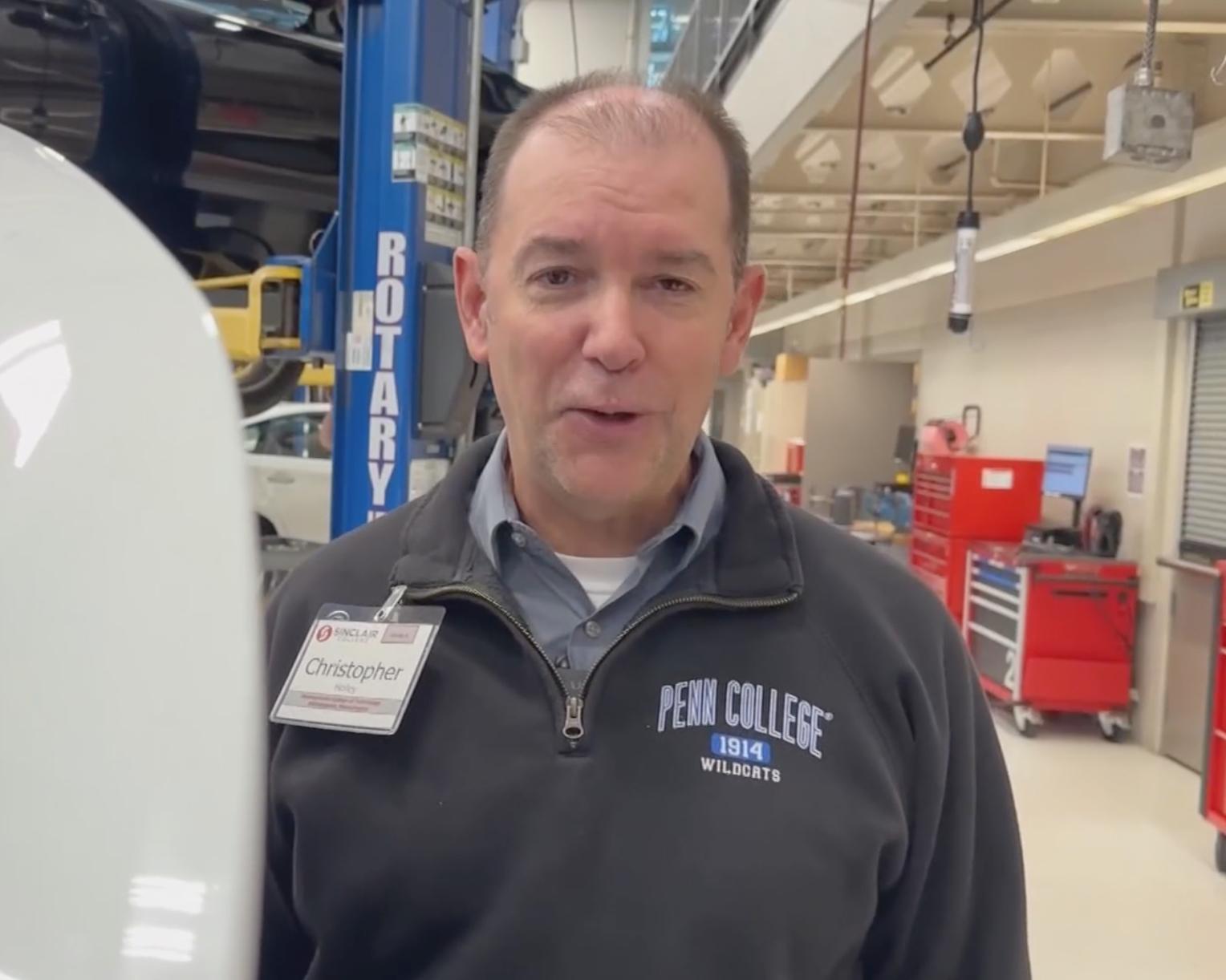 Christopher J. Holley, assistant professor of automotive technology at Pennsylvania College of Technology, was featured in a July 25 report by Spectrum News 1, of Columbus, Ohio. The cable television news outlet covered the 2024 Battery Electric Vehicle Summer Institute at Sinclair Community College in Dayton, Ohio, attended by Holley and his Penn College colleague, Charles F. Probst, automotive/Honda PACT instructor.