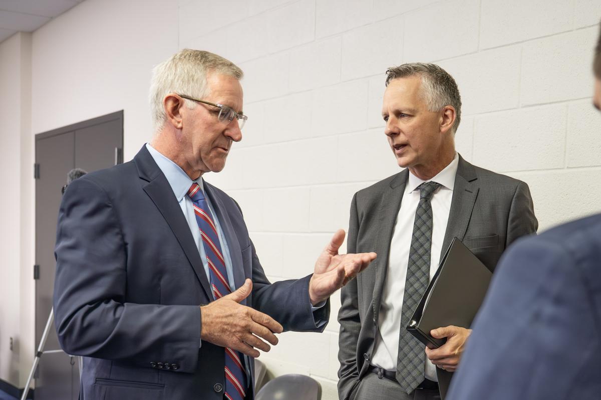 Redding, left, chats with Penn College President Michael J. Reed, who also spoke during the Earth Science Center ceremony.