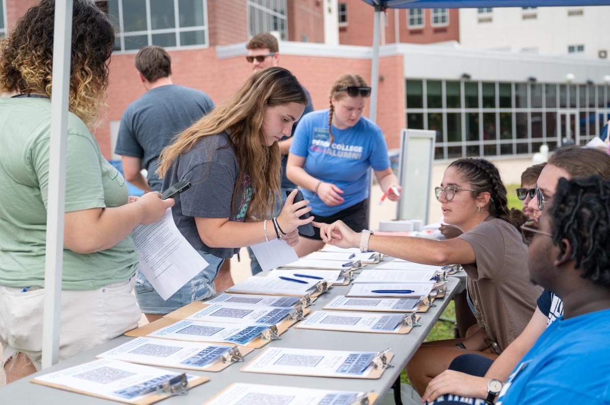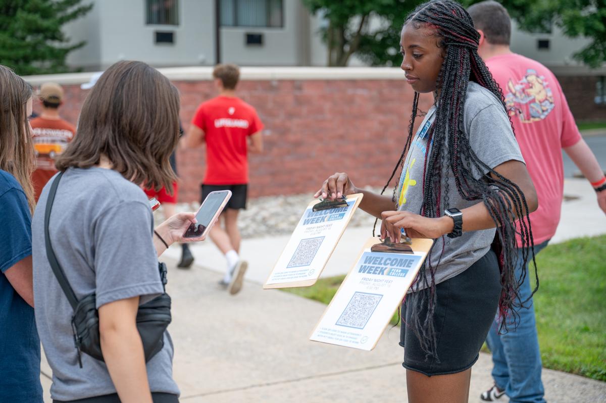 Lending a hand with codes for students to scan is Kaylynne Lee-Taalibuddeen, a resident assistant and peer mentor in the Hudock Center for Academic Excellence.