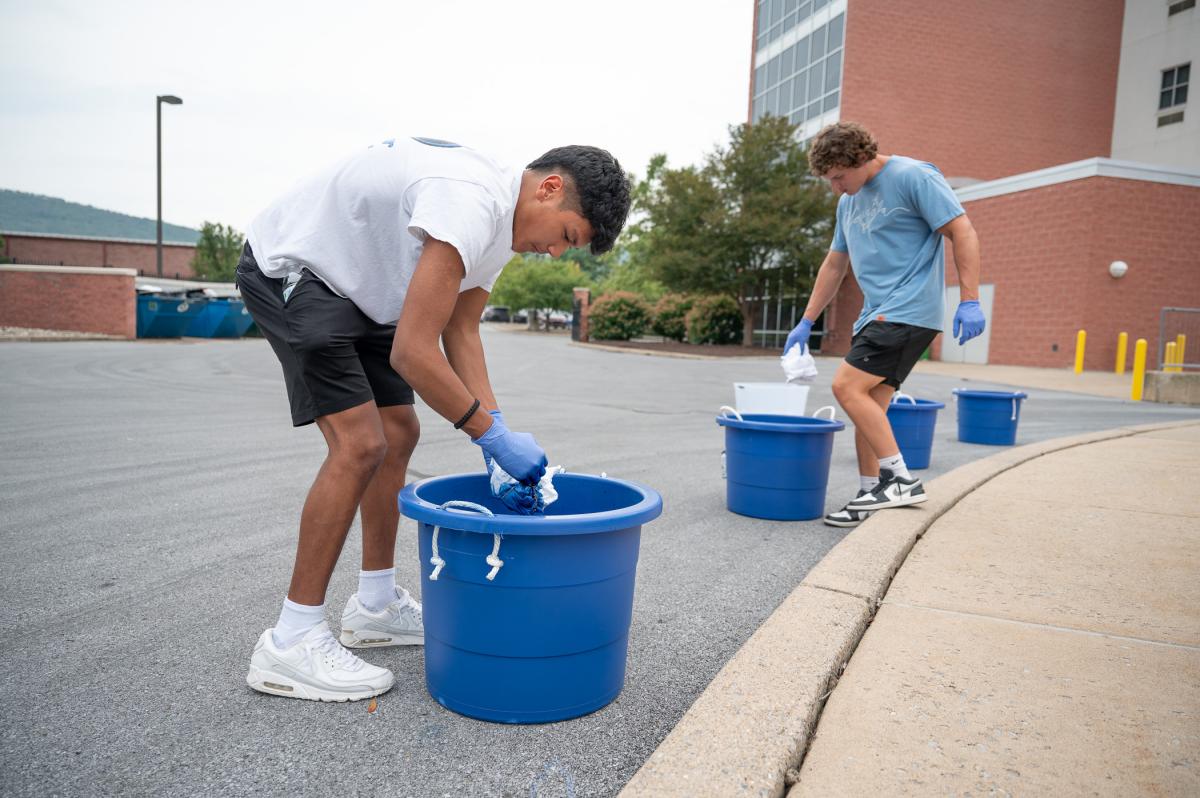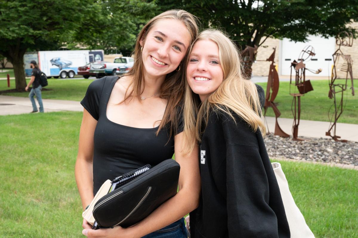 Demonstrating the best way to start a new semester: Caila Flanagan (left), senior residence life area coordinator, and Cierra D. Miller, a resident assistant