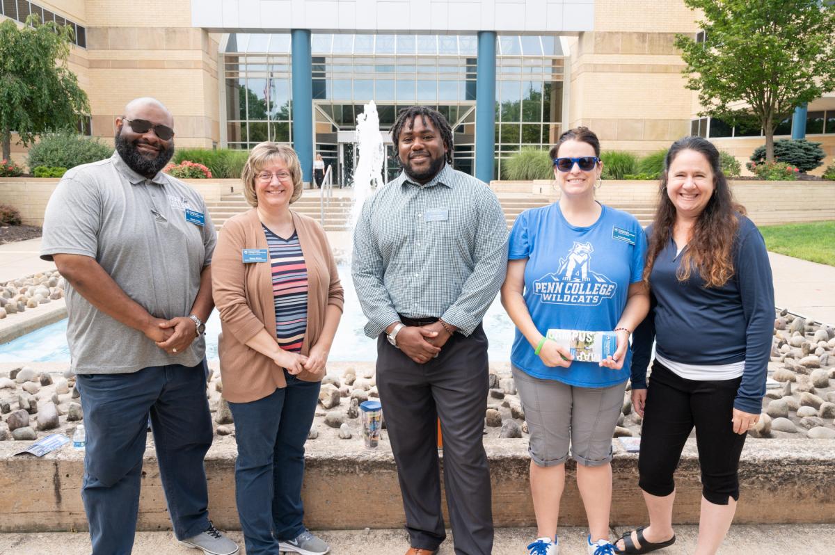 Among the team greeting the class-bound 'Cats are (from left): Chuck D. Crews Jr., assistant director for secondary partnerships; Stacey L. Girven, career and alumni events manager; Nate Woods Jr., special assistant to the president for inclusion transformation; Laura M. Machak, coordinator of secondary partnership operations; and Allison M. Savage, coordinator of student success.
