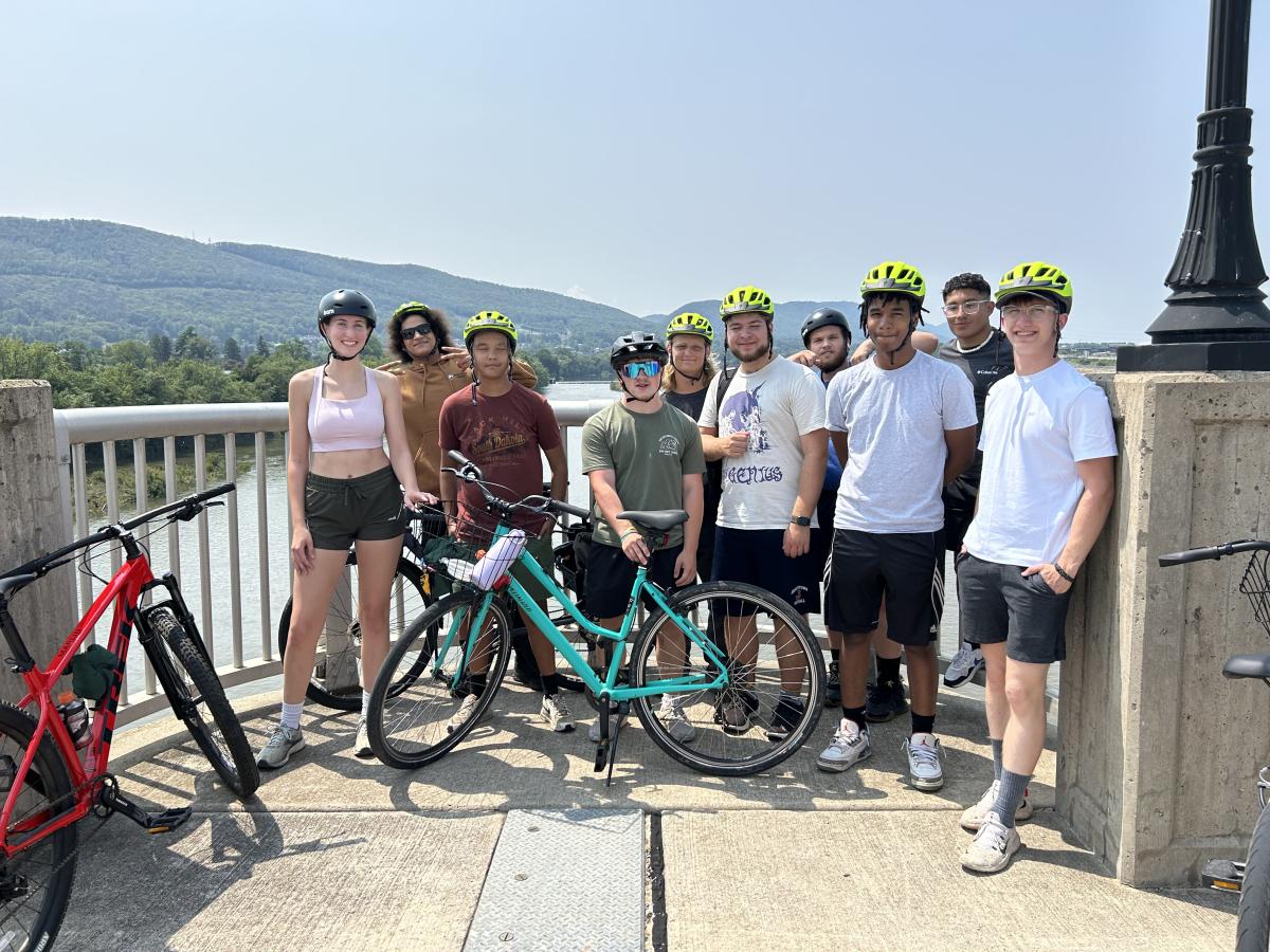 The biking bunch breaks (and brakes) for a group photo along the scenic Susquehanna Riverwalk. (Photo courtesy of Rob Cooley, professor of anthropology/environmental science)