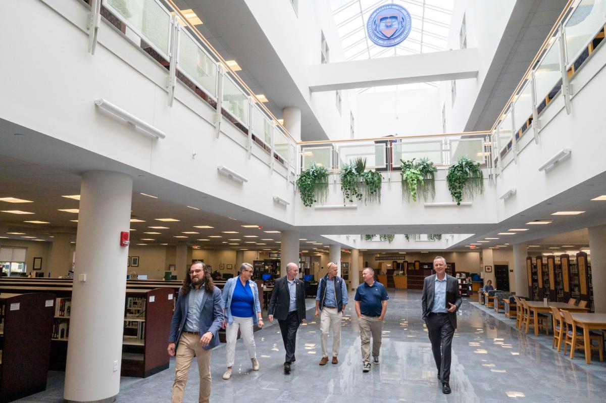 On their way to the Center for Career Design, the group makes its way through The Madigan Library. Assisting on the tour are Pace (far left) and Marty (at center).