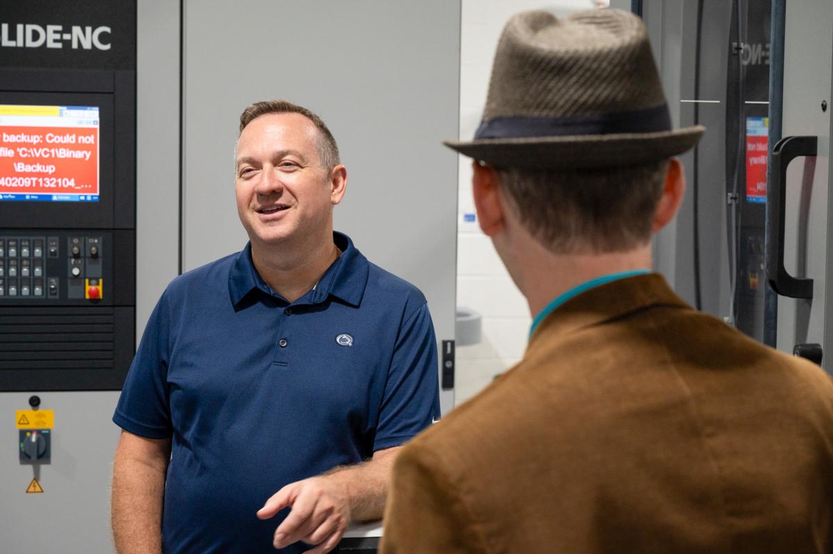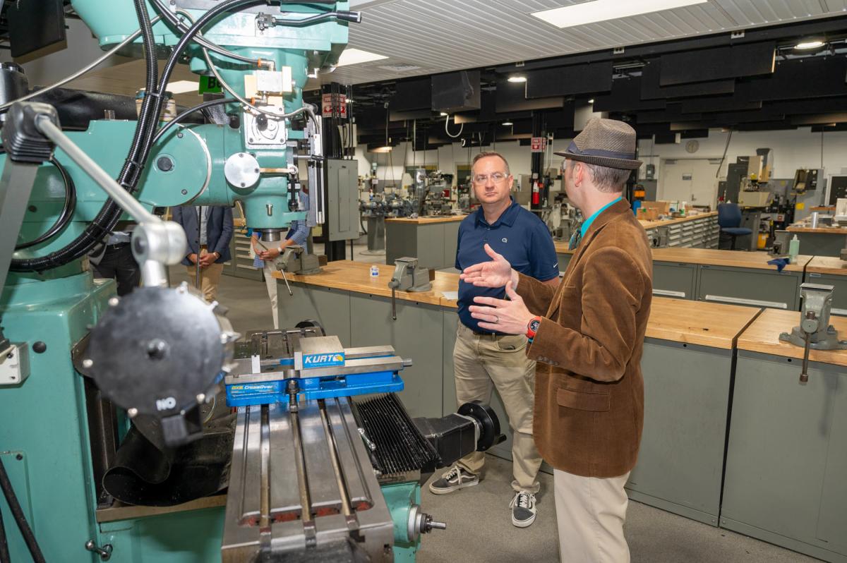Schweyer and Webb converse in the Larry A. Ward Machining Technologies Center.