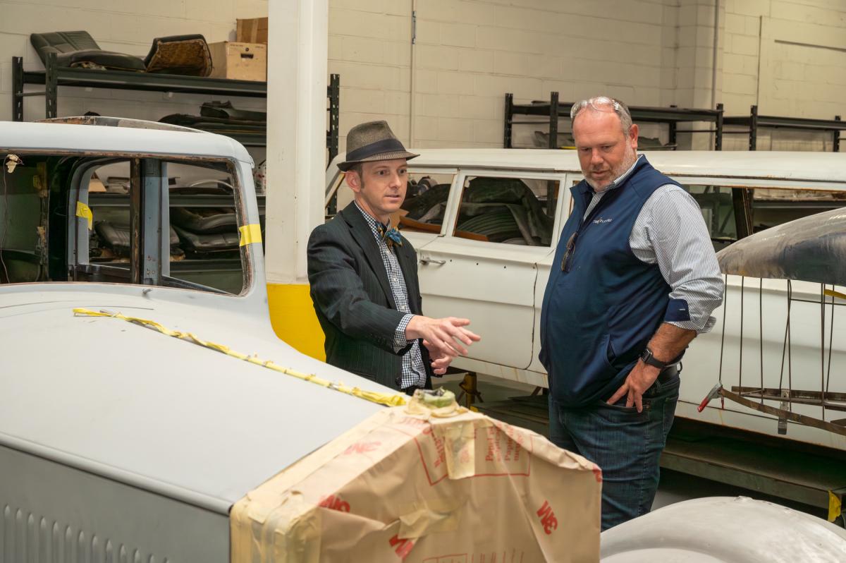 In the automotive restoration lab, Webb and Topper discuss the attention being given to a Rolls Royce. Behind them is a stretched Chevrolet station wagon owned by the Milton Hershey School.