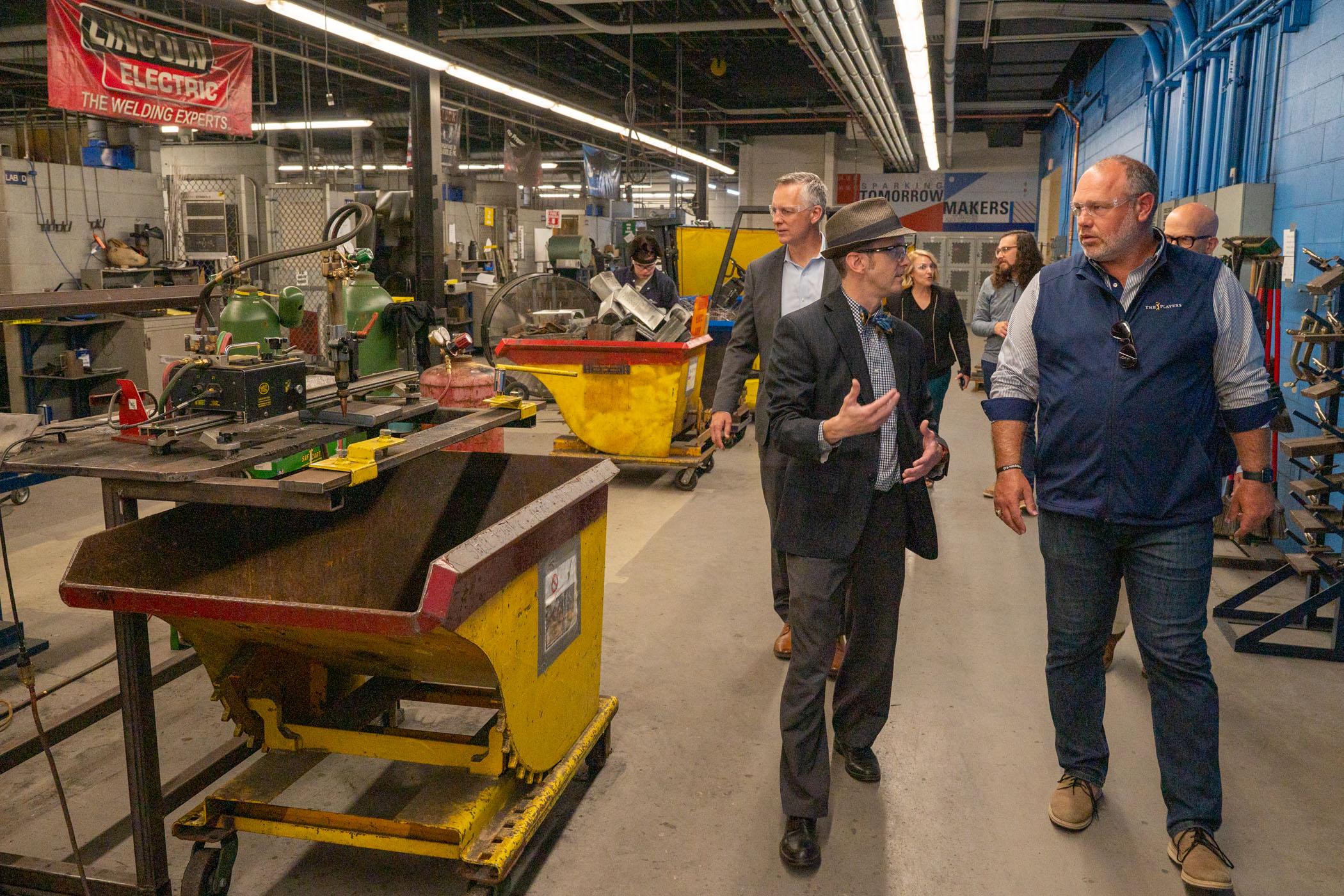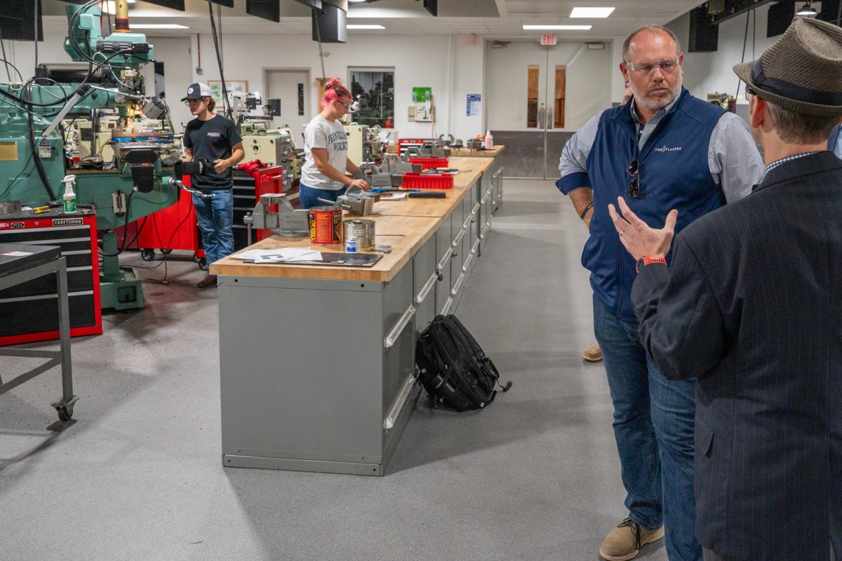 As students work in the Larry A. Ward Machining Technologies Center, the special guest learns about the array of equipment igniting exploration and innovation.