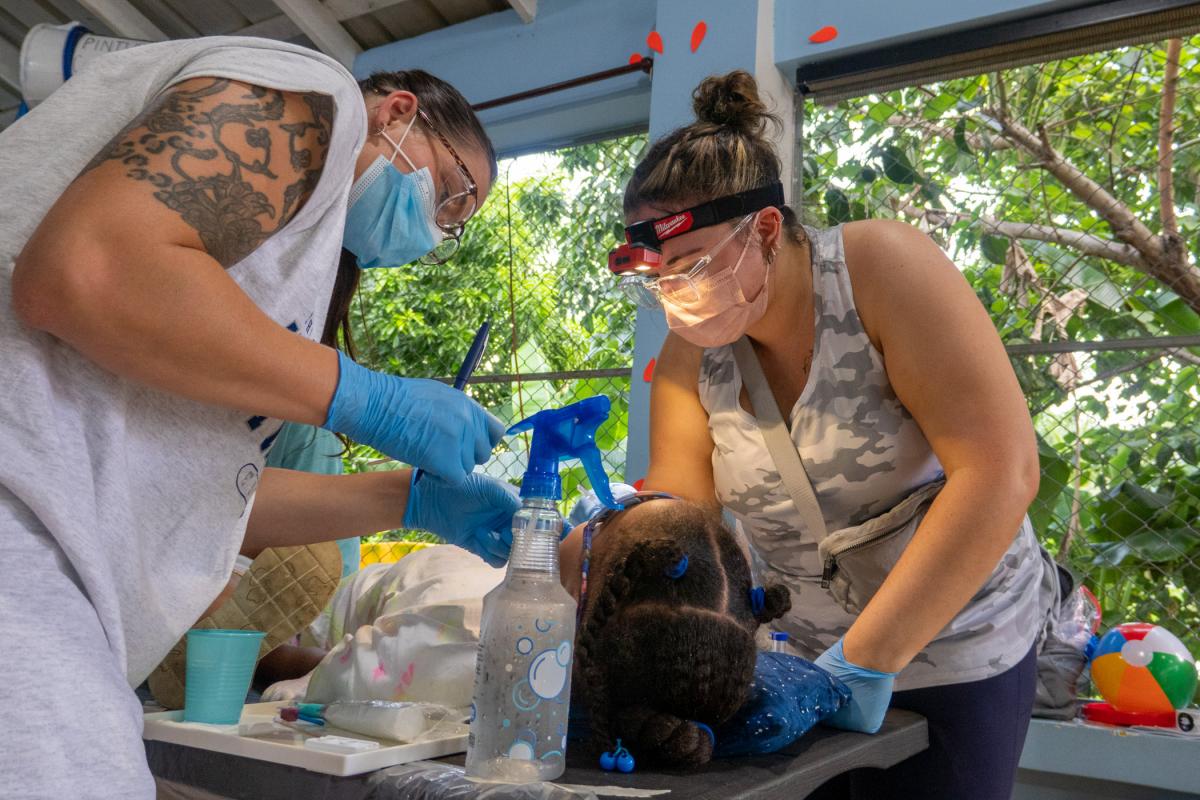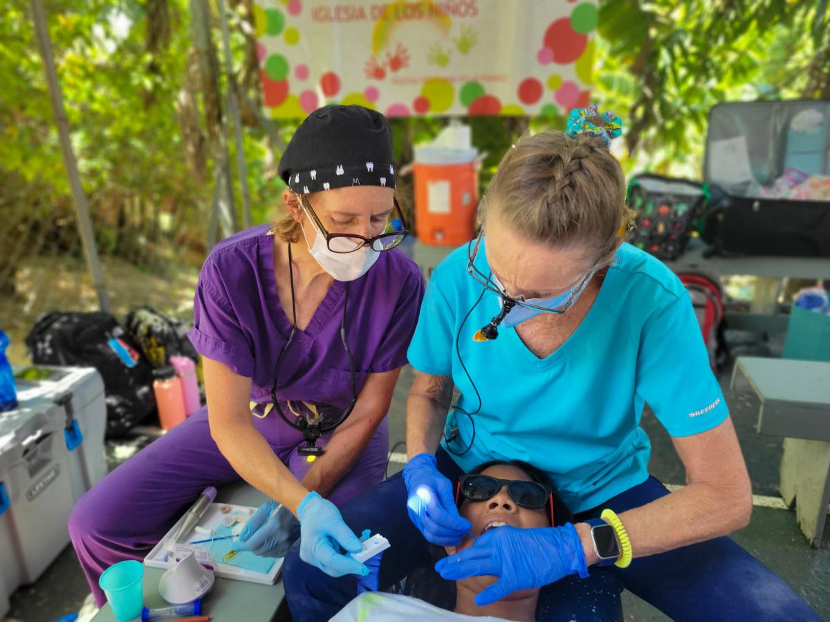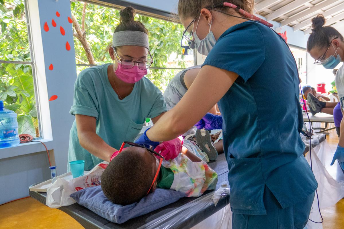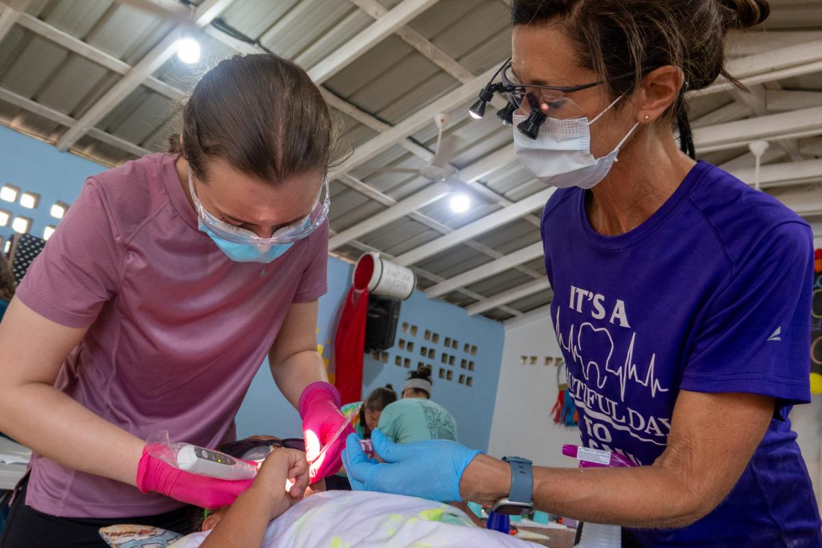 Pennsylvania College of Technology dental hygiene student Rachel A. Doyle (left) works alongside Regan G. Kline, an associate degree graduate and current student in the college’s bachelor’s in dental hygiene, to provide dental care to a child at a community center in the Dominican Republic village of Zion. Doyle is from Lincoln University, and Kline is from Mechanicsburg.