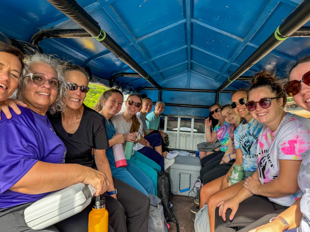 The group gathers aboard the back of a truck for its daily commute. (Photo by Patricia A. Durand, part-time instructor of dental hygiene)