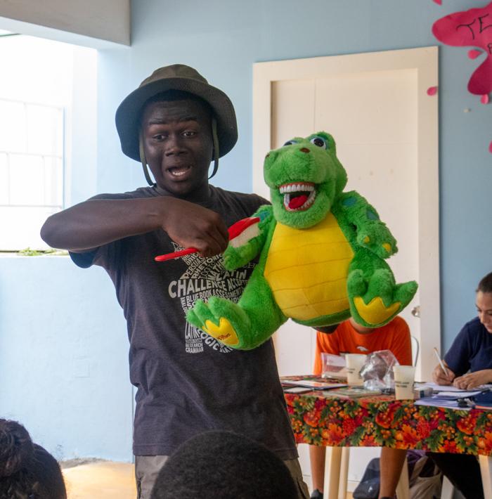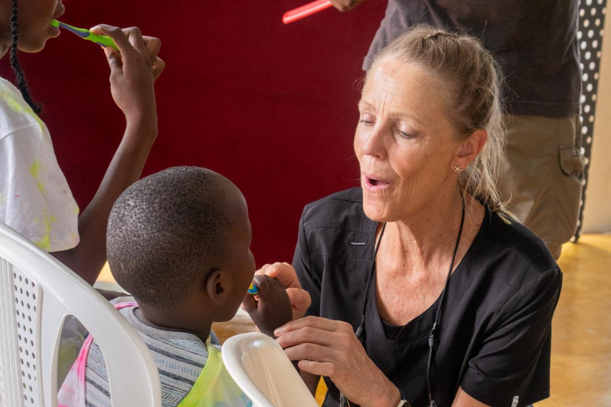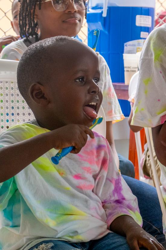 A CUPS Mission staff member and interpreter for the group provides a toothbrushing lesson for children before they have their teeth cleaned and treated.