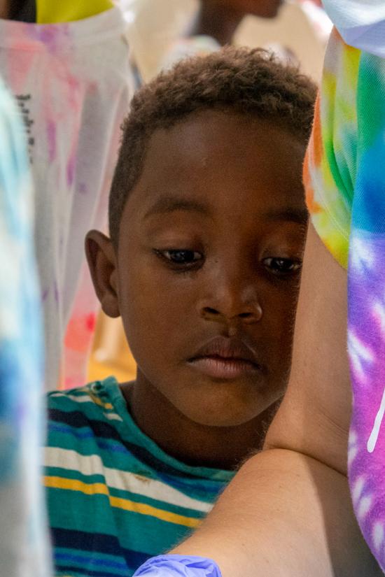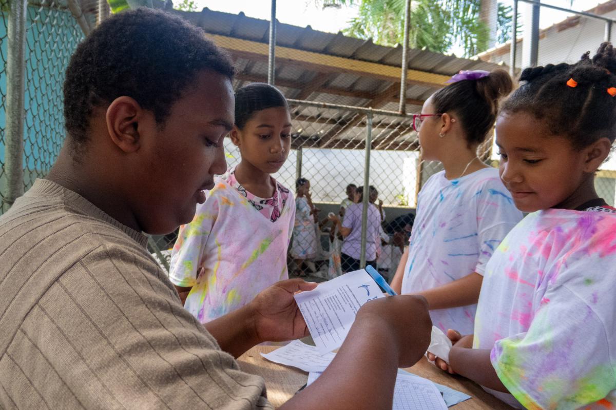 With help from a local volunteer, children check in to a clinic in Paraiso village.