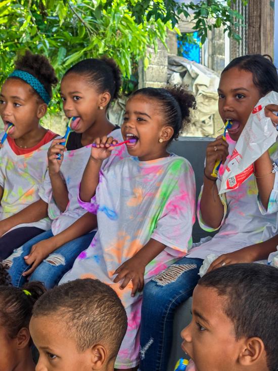Children – wearing provided tie-dye T-shirts to protect their own clothing during their exam – practice brushing in Paraiso. (Photo by Karlee Moyer ’18)