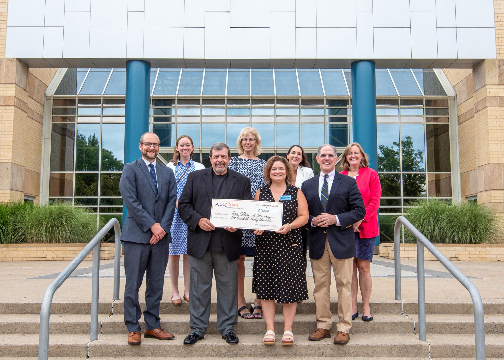 AllOne Foundation & Charities representatives gather with staff from Pennsylvania College of Technology to present a gift that will help the college to purchase a labor and delivery patient simulator and pilot a summer bridge program for students entering the pre-program semester in health sciences majors in 2025. From left: Kyle A. Smith, executive director of college relations, Penn College; Nora Kern, program officer, AllOne Foundation & Charities; Paul Rooney, AllOne Foundation board member; Joanna K. Flynn, vice president for academic affairs/provost, Penn College; Valerie A. Myers, dean of nursing and health sciences, Penn College; Ashley E. Day, manager of grants and communications, Penn College; John Cosgrove, CEO, AllOne Foundation & Charities; and Mary Carroll Donahoe, chief program officer, AllOne Foundation & Charities.