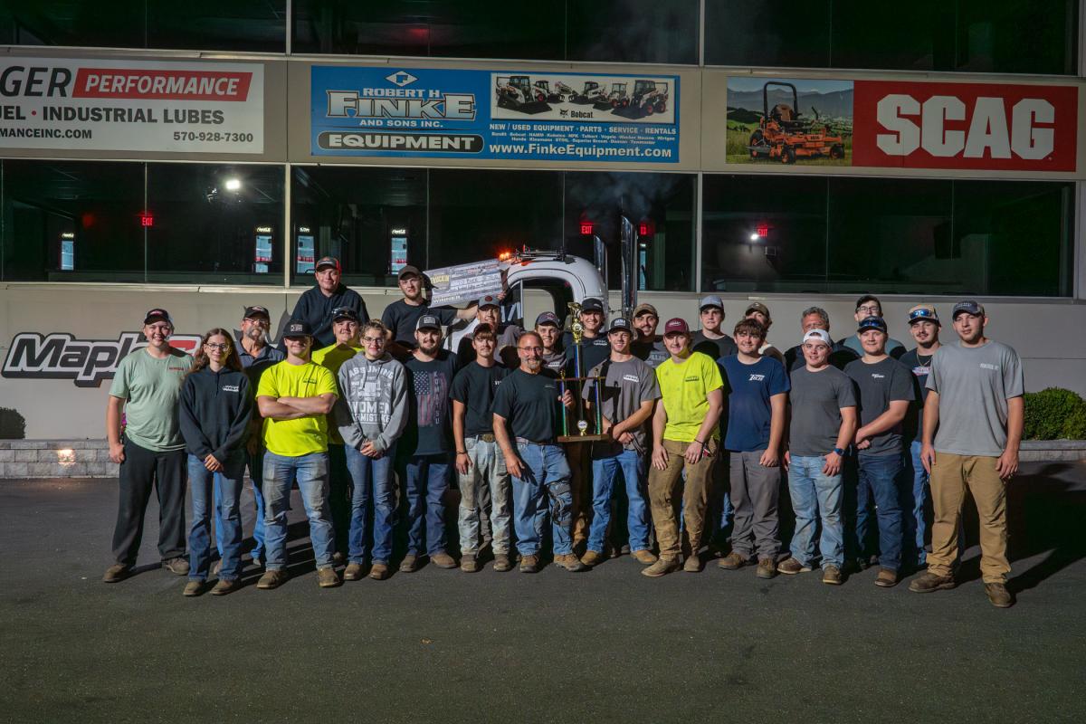 As the daylong competition draws into night, the team celebrates its first No. 1 win at a sanctioned event. At center holding the trophy is Mark E. Sones, the faculty member who set the college's Mack drag truck project into motion more than 26 years ago.