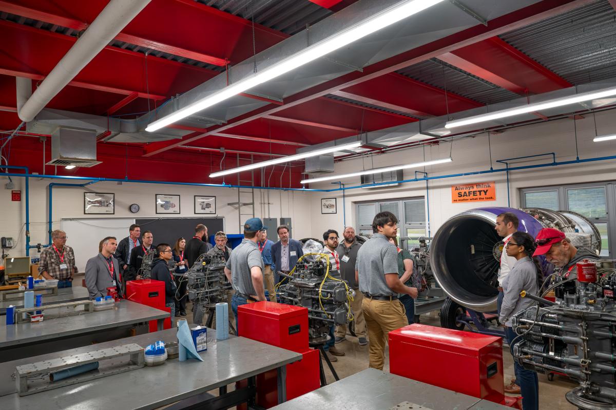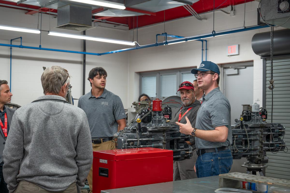 Gautsch (at center in blue hat) and McGill guide the tour group through an engine lab at Penn College's Aviation Center.