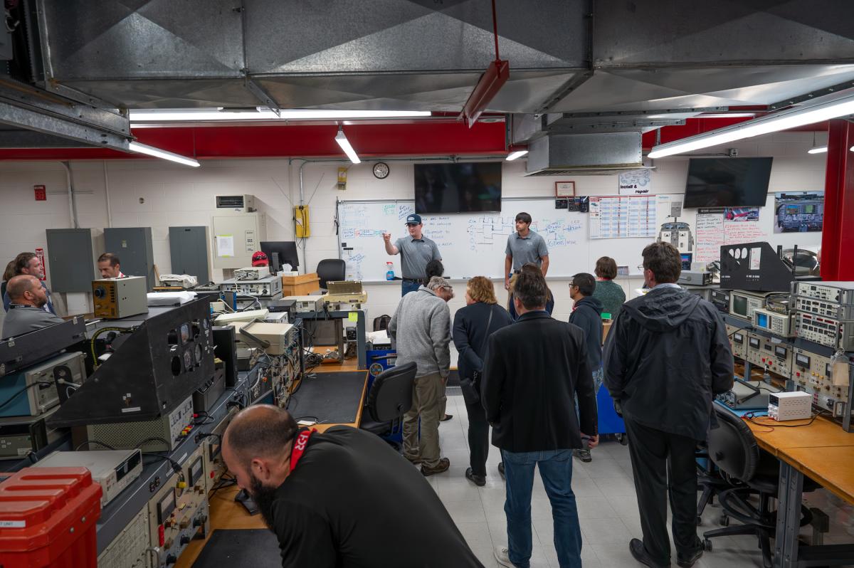 The tour explores the Aviation Center's avionics room. Other dedicated labs at the facility focus on advanced composites, sheet metal fabrication, turbine engines and reciprocating engines.