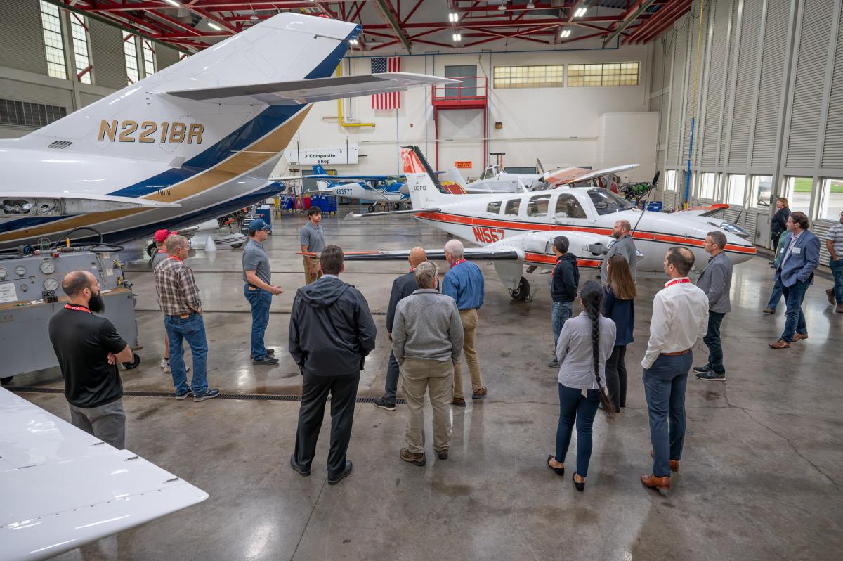 On Monday, conference attendees enjoyed tours of Penn College’s Lumley Aviation Center, Williamsport Regional Airport, Lycoming Engines and Energy Aviation. The college’s 50,000-square-foot facility, adjacent to the airport, features a hangar and a fleet of 20 aircraft used for instructional purposes, including a donated Boeing 727 cargo plane, a Bombardier CL-600 Challenger jet, a Dassault Falcon corporate jet and four different helicopters.