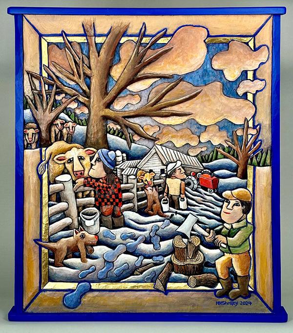 "Spencer New York Barn with Big Tree" by Shelley; carved pine, acrylic paint, gold leaf; 33.5 inches by 28.5 inches by 1.5 inches.