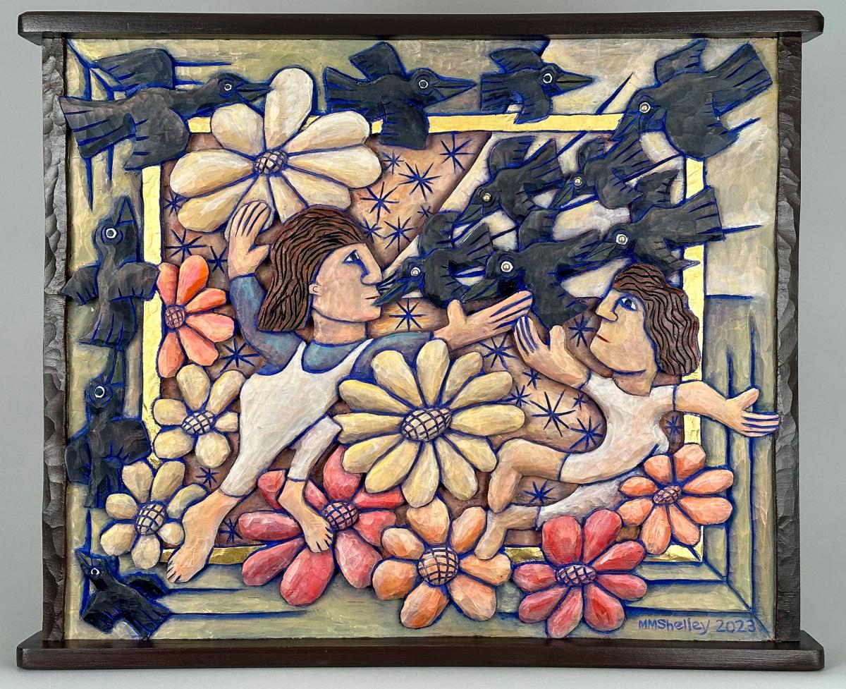 “Flower Dance,” by Mary Michael Shelley; carved pine, acrylic paint, gold leaf, brass tacks; 22.5 inches by 27 inches by 1.5 inches. Shelley's exhibition, “Art of the Everyday,” is on display through Nov. 26 in The Gallery at Penn College. An artist’s reception is set for Nov. 7, with remarks and a low-relief wood carving demonstration.