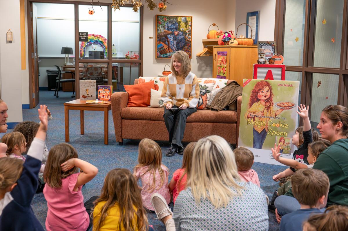 Penn College alumna Judi L. Jessick shares her book, "Agatha Livermore and the Magic Cookie Spoon," with youngsters at the Dunham Children's Learning Center.