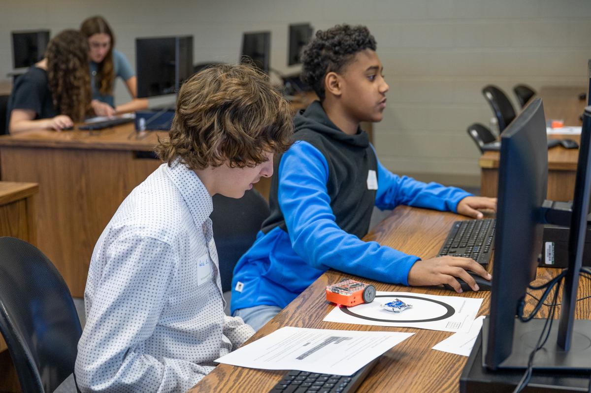 Participants at Pennsylvania College of Technology’s Cyber Challenge Day code an Edison robot to detect the removal of a piece of candy. The event attracted over 100 middle and high school students and teachers who learned basic cyber skills and discovered cybersecurity career possibilities.