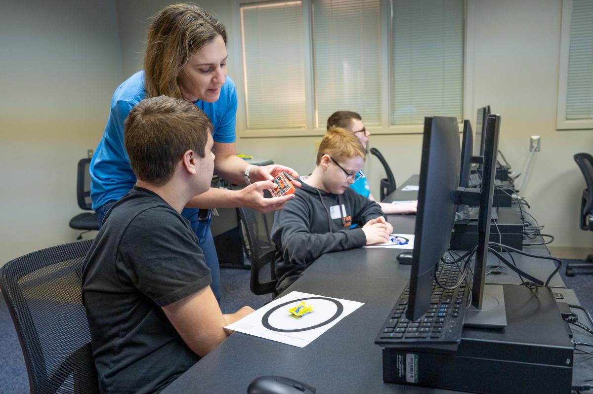 Alicia L. McNett (standing in blue shirt), assistant professor of computer information technology and coordinator for Cyber Challenge Day, works with a young guest.