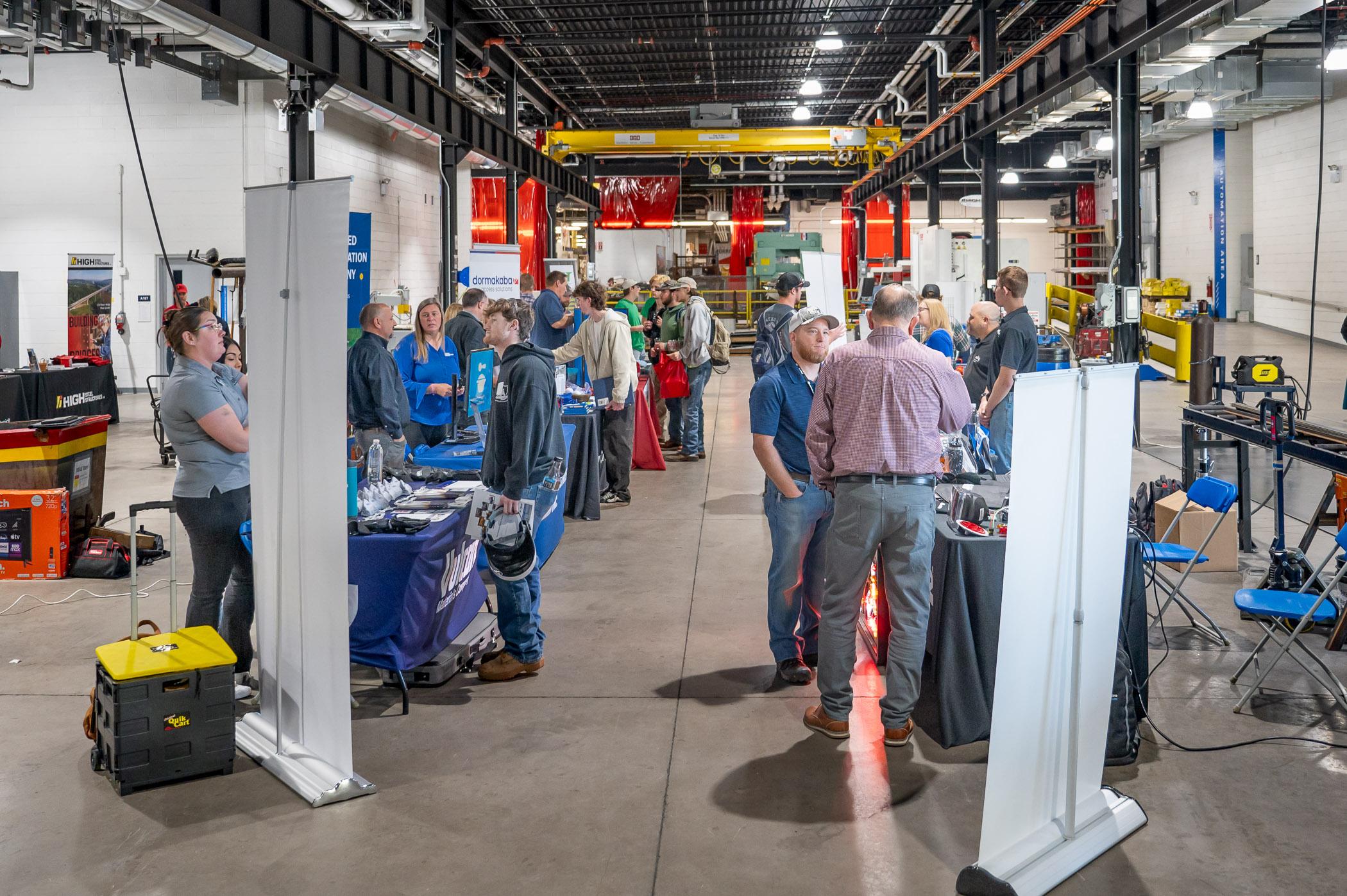 Penn College's welding lab hosts a recent Recruitment Day, offering networking opportunities for students in automated manufacturing and welding & metal fabrication.