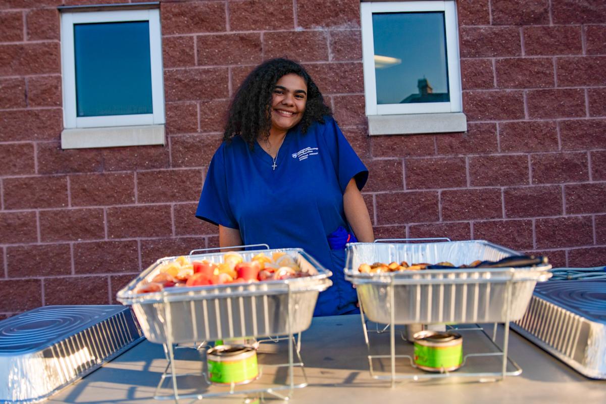Marina Botros, a physician assistant studies student from Raleigh, North Carolina, pitches in to serve up free food.