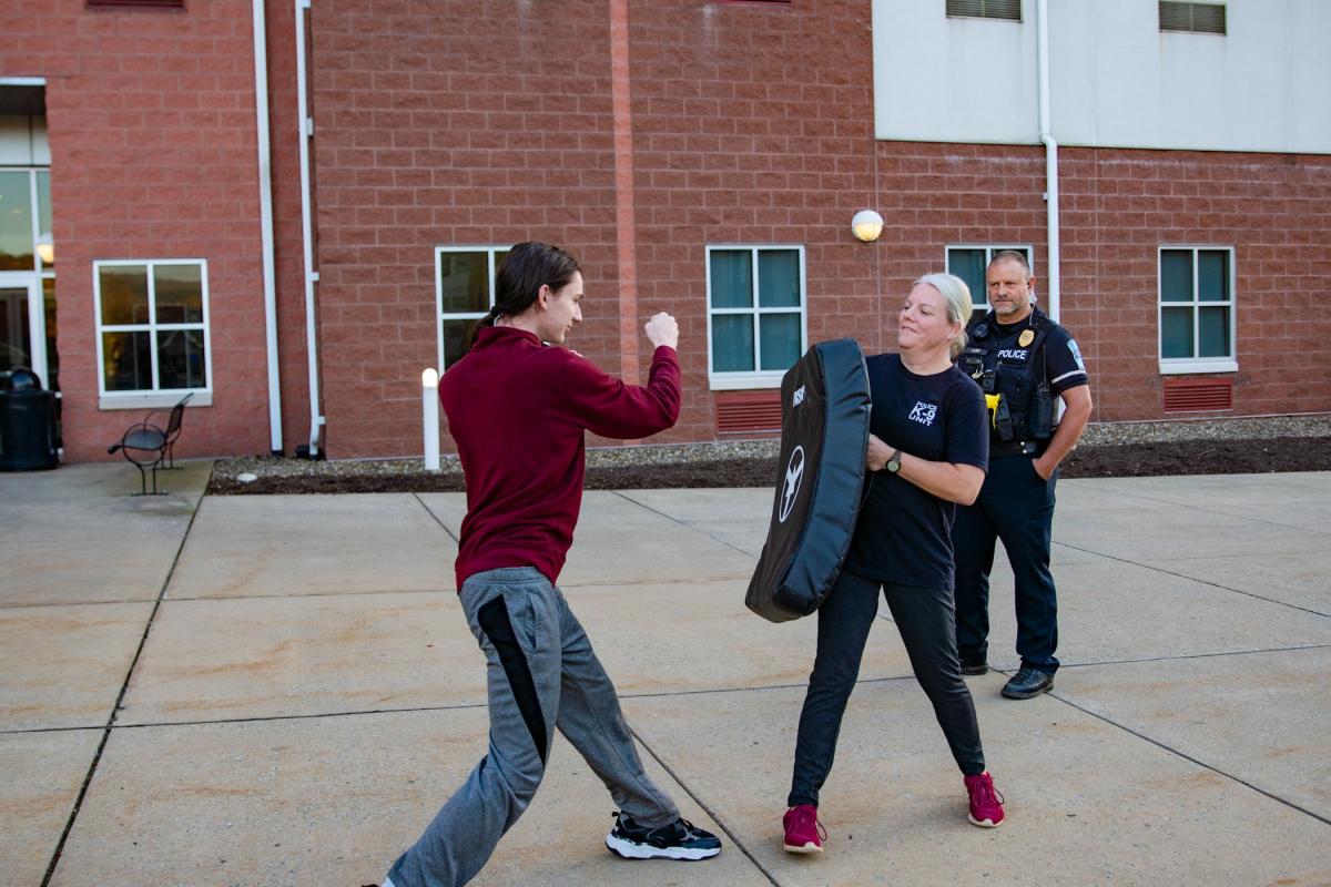 Officer Catherine Farr offers a helping hand and lesson in self defense. Lt. Fletcher Farr watches on in the background.
