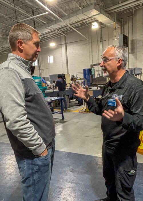 Meyer (at left) receives background information on the automotive restoration program from Klinger.