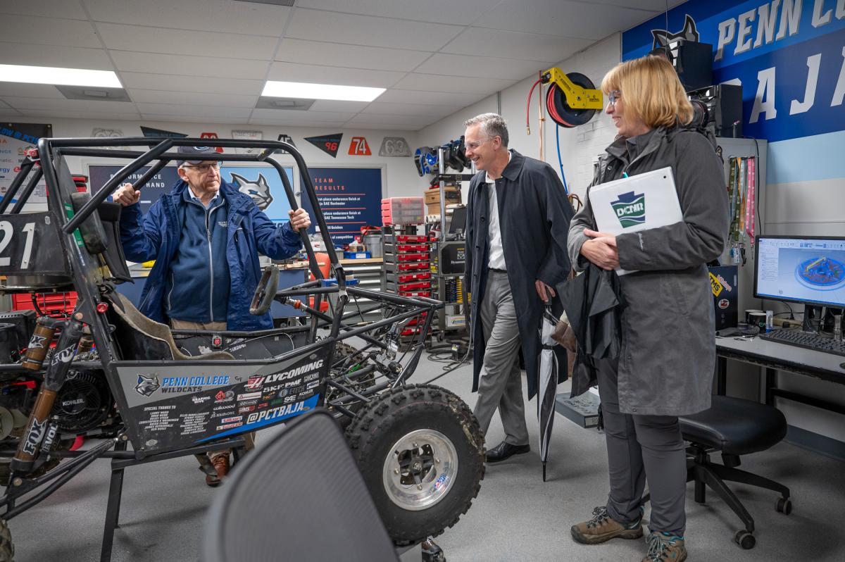In The Baja Room, Dunn (at right) learns about the recent successes of the Penn College Baja SAE team from Yaw (left) and Penn College President Michael J. Reed, two of the team's biggest fans.