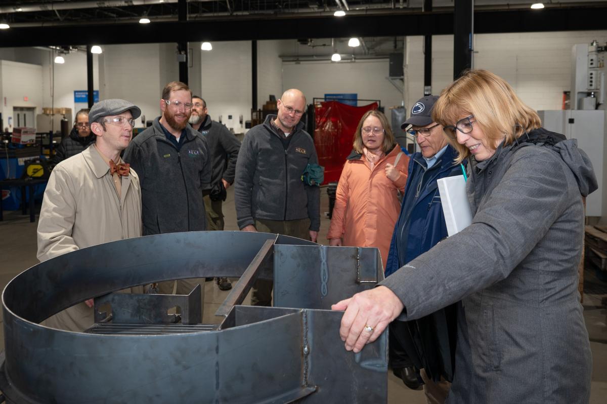 The DCNR entourage enjoys seeing a stack of outdoor firepits in the welding lab. In the foreground (from left) are: Bradley M. Webb, dean of engineering technologies; Hoy; Cassell; Jantz; Yaw and Dunn.