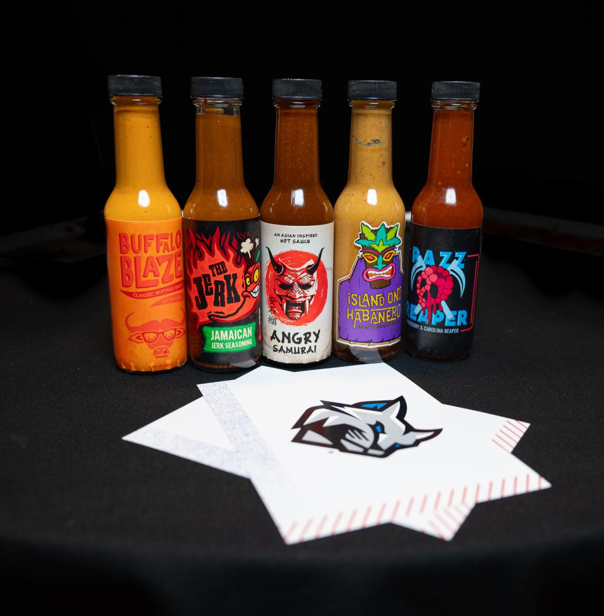 The concoctions – from mildest to hottest: Buffalo Blaze (classic Buffalo sauce with a kick), The Jerk (Jamaican jerk seasoning), Angry Samurai (an Asian-inspired hot sauce), Island Ono Habanero (pineapple habanero Hawaiian) and Razz Reaper (raspberry and Carolina reaper) – were developed by chefs Brett M. Bertin and Charlie M. Suchanec, who help to staff the hospitality program’s Le Jeune Chef Restaurant. Bertin is the restaurant’s chef de cuisine, while Suchanec, of Tyrone, is its chef de partie, as well as a culinary arts technology and applied management student.