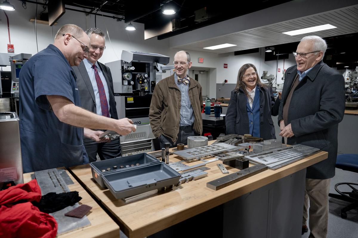 Upbeat and informative, the Penn College tour for state Secretary of Labor & Industry Nancy A. Walker (second from right) makes its way through the Larry A. Ward Machining Technologies Center, guided by (from left) Howard W. Troup, assistant professor of automated manufacturing/machine tool technology; Penn College President Michael J. Reed; Bradley M. Webb, dean of engineering technologies; and state Sen. Gene Yaw, chairman of the college’s Board of Directors.