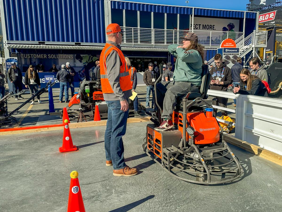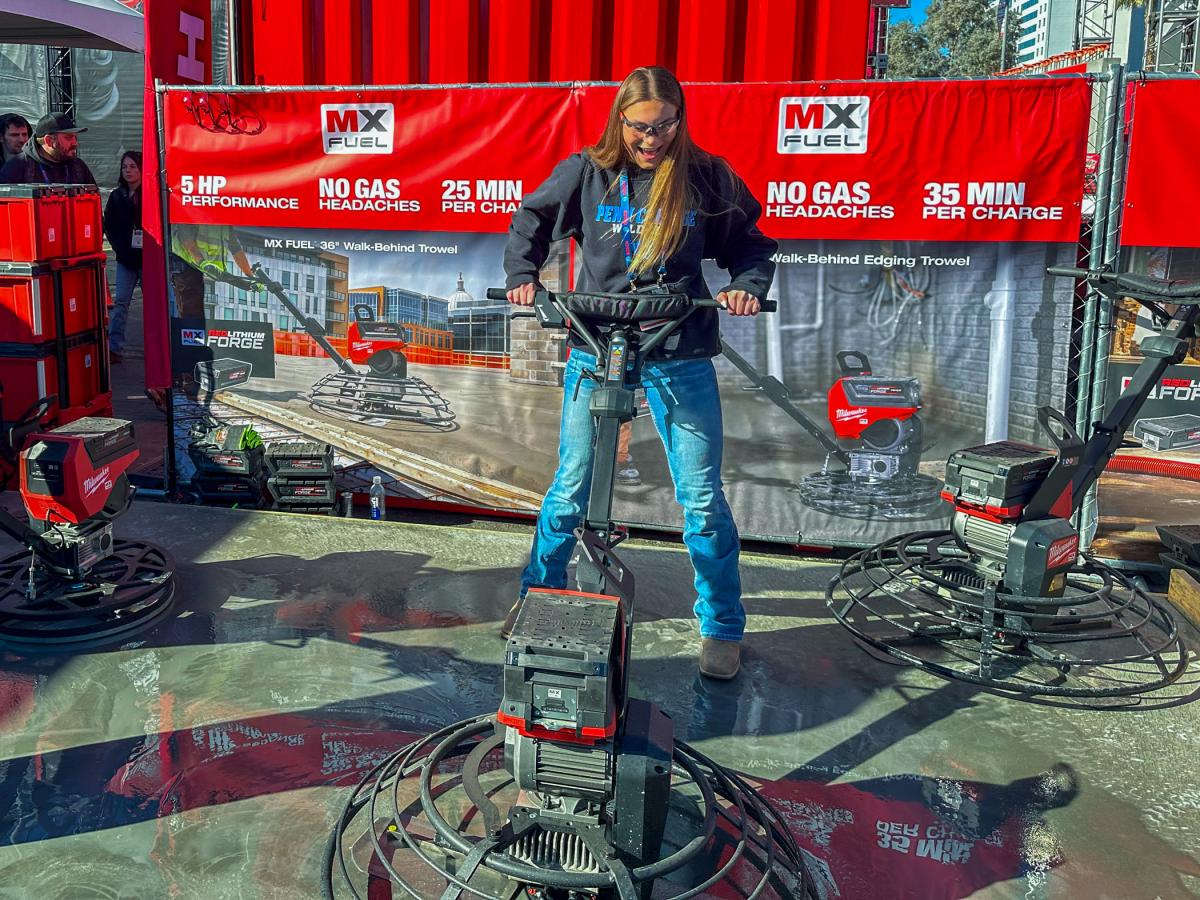 Sara A. Darlington tests a new battery-powered trowel machine. Darlington completed a degree in building construction technology in 2024 and is pursuing degrees in concrete science technology and residential construction technology & management.