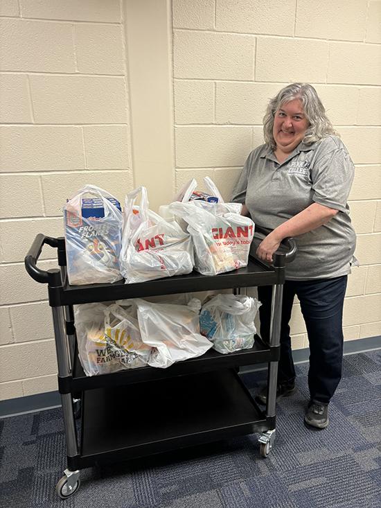 Brenda M. Kline, office assistant to counseling services, was making her way to The Cupboard, Penn College’s food pantry for students in need of food assistance, with a cartload of food to donate in observance of her 37th work anniversary at the institution.