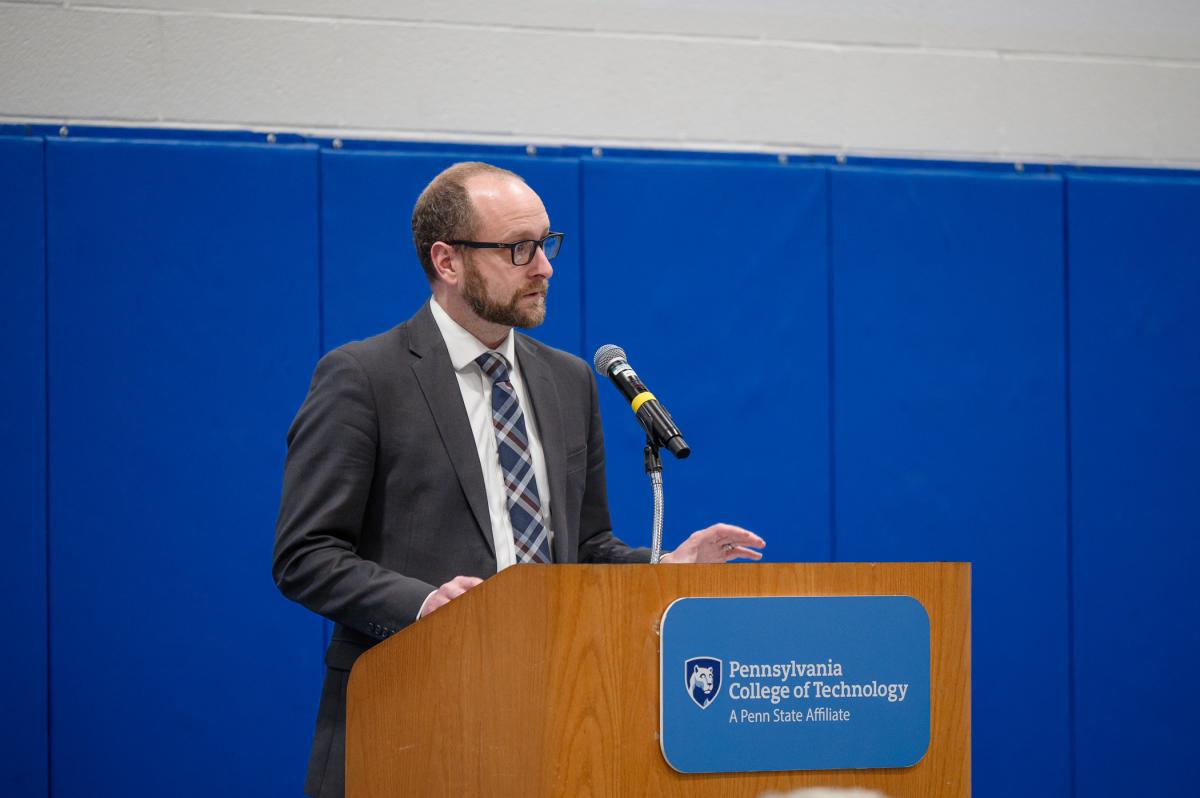 Also addressing the gathering was Kenneth F. Healy, executive vice president/director of engineering at PMF Industries, Inc. An alumnus of the college’s manufacturing engineering technology and engineering drafting majors, Healy serves on Penn College’s Foundation Board. Aiming to empower innovative students, he and his wife created the Ken and Kristie Healy Foundation Scholarship and provided generous funding to renovate the Baja Room for the Baja SAE student team.