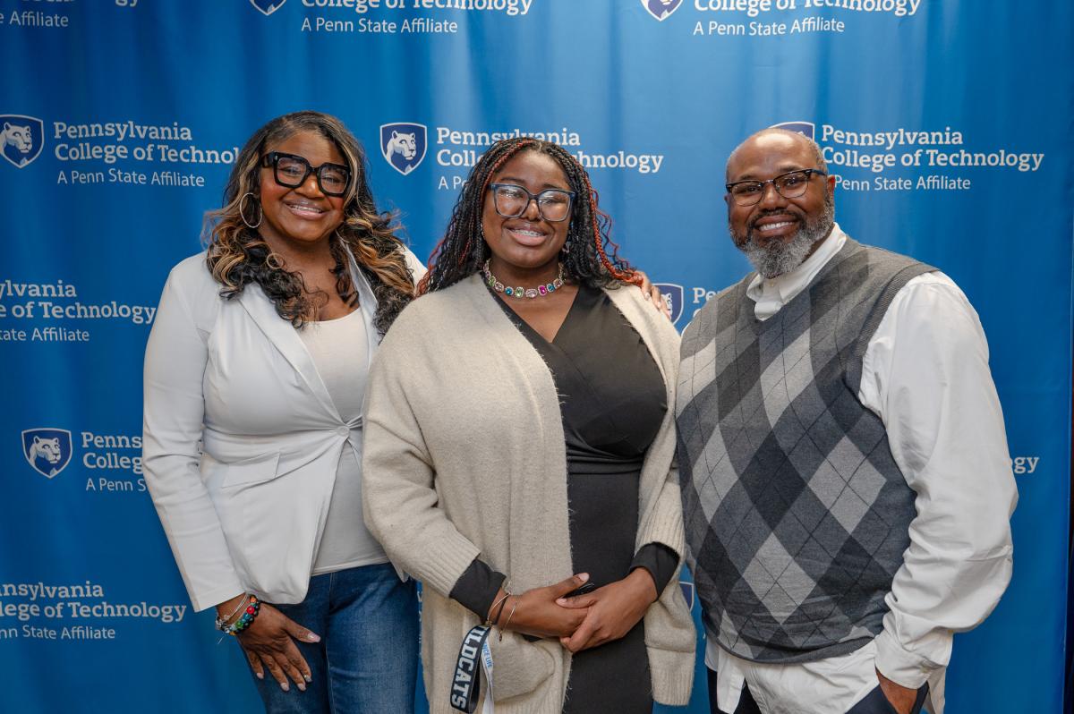 Nylah Hill (center), an aviation maintenance technology student and recipient of the NSF S-STEM Transportation Scholarship, brought along her parents, Erica and Curtis.