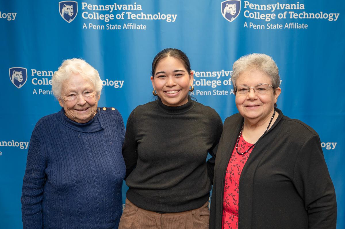 Scholarship donors Annmarie Phillips (left), representing the Phillips Family Scholarship, and Ann Brouse (right), representing the Gary E. Brouse Memorial Scholarship, make a memory with applied management student Alyssa Perez, a multi-scholarship recipient.