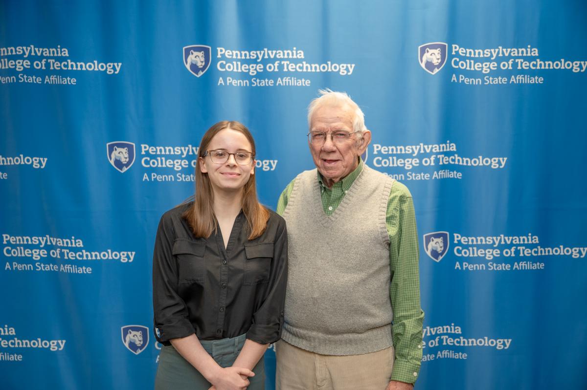Leah Bear (left), engineering design technology, unites with her scholarship's namesake: Chalmer Van Horn Engineering CAD Technology Scholarship. Van Horn is a college alumnus and professor emeritus of drafting.