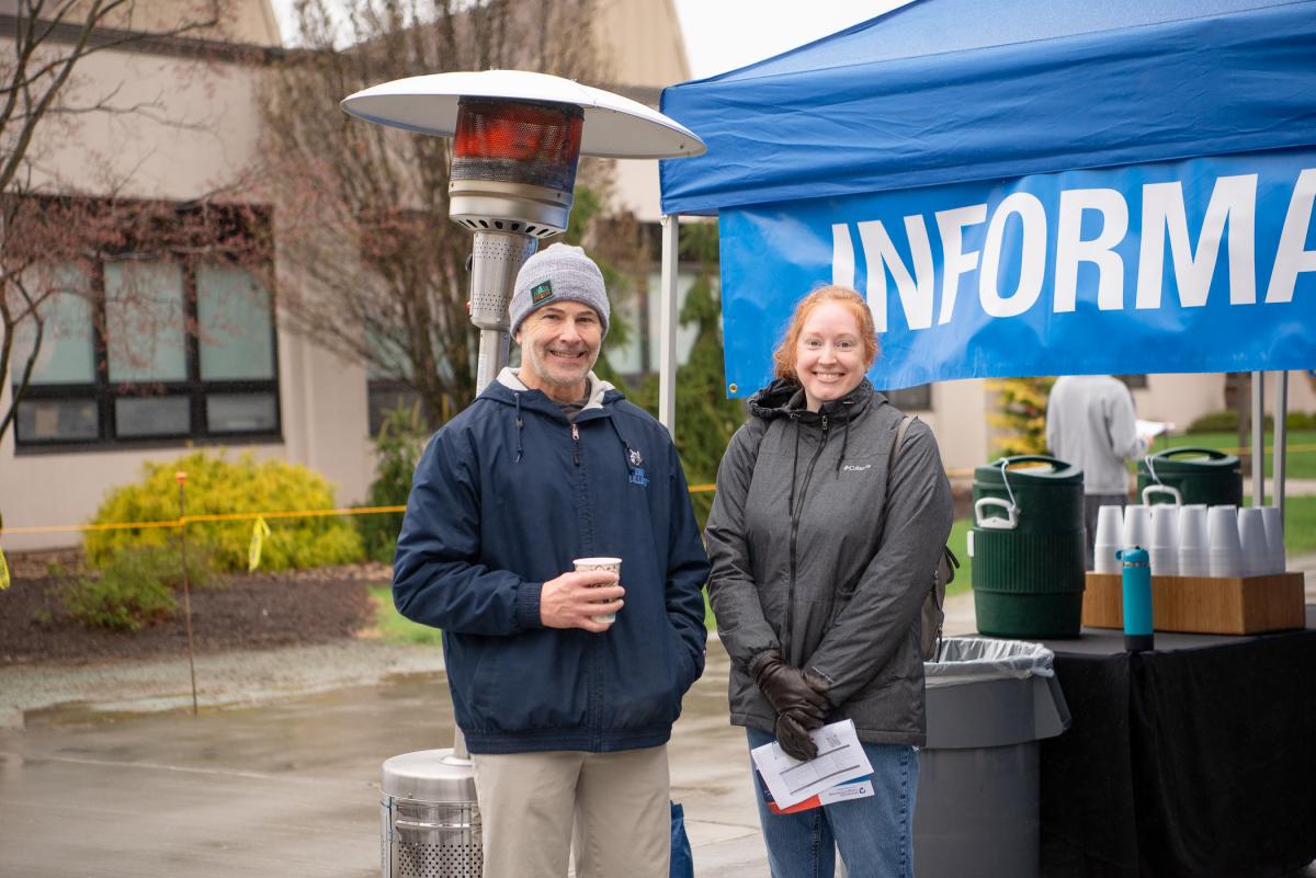 ... where warm smiles greet guests. Counselor Michael S. DiPalma (left) and Lindsey A. Harner, Clean Energy Center program coordinator, are among the college helpers.