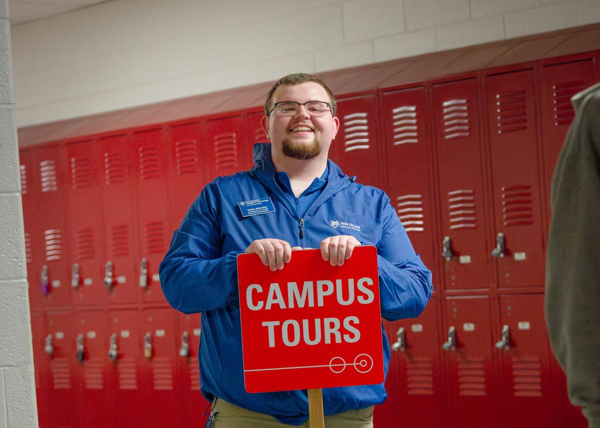 Admissions tour guide Kellor A. Schooley stands ready to assist with his trademark smile and enthusiasm. The business administration senior from Turbotville is eying graduation, and this was his last Open House.