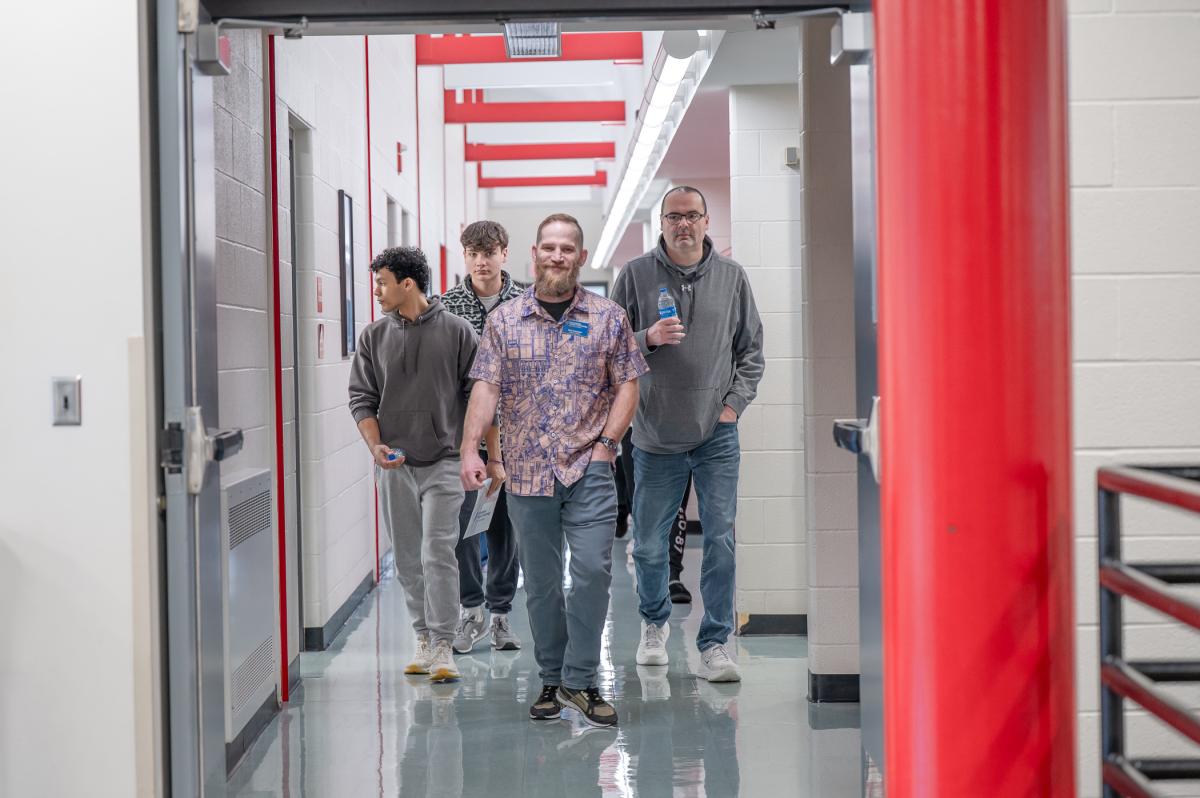 Nick R. Thompson, aviation maintenance instructor, leads a tour through the second floor of the Lumley Aviation Center ...