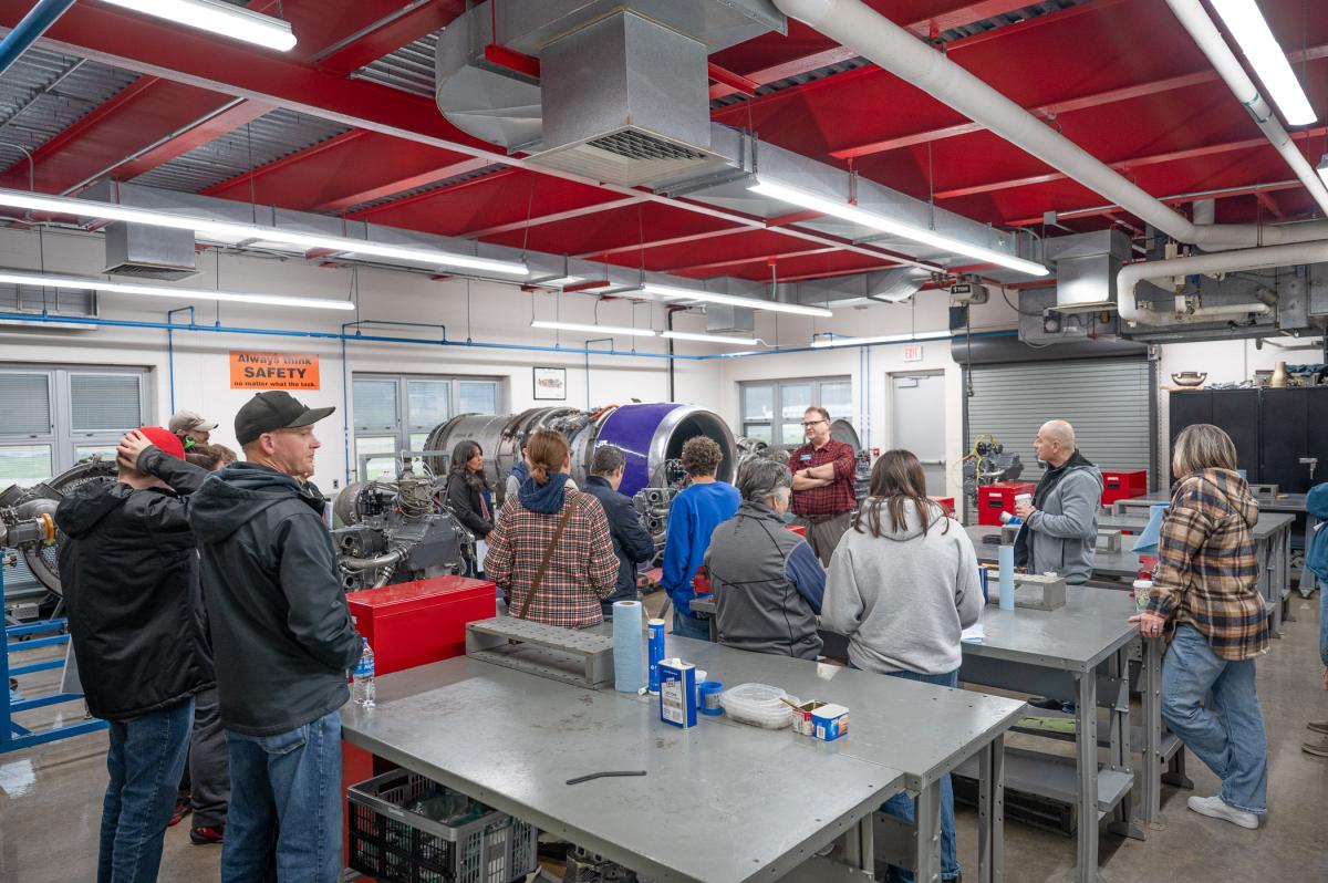 Aviation maintenance instructor Michael Damiani (in background facing audience) discusses the college's connection to the esteemed Lycoming Engines company.