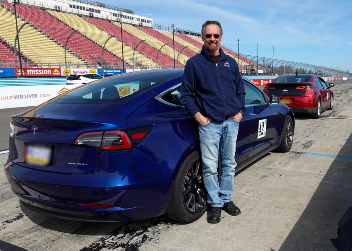 David P. Showan, associate professor of automotive technology, stands next to his 2020 Tesla Model 3, winner for most energy-efficient full electric. The car also recorded the fastest time in the autocross for full electric.