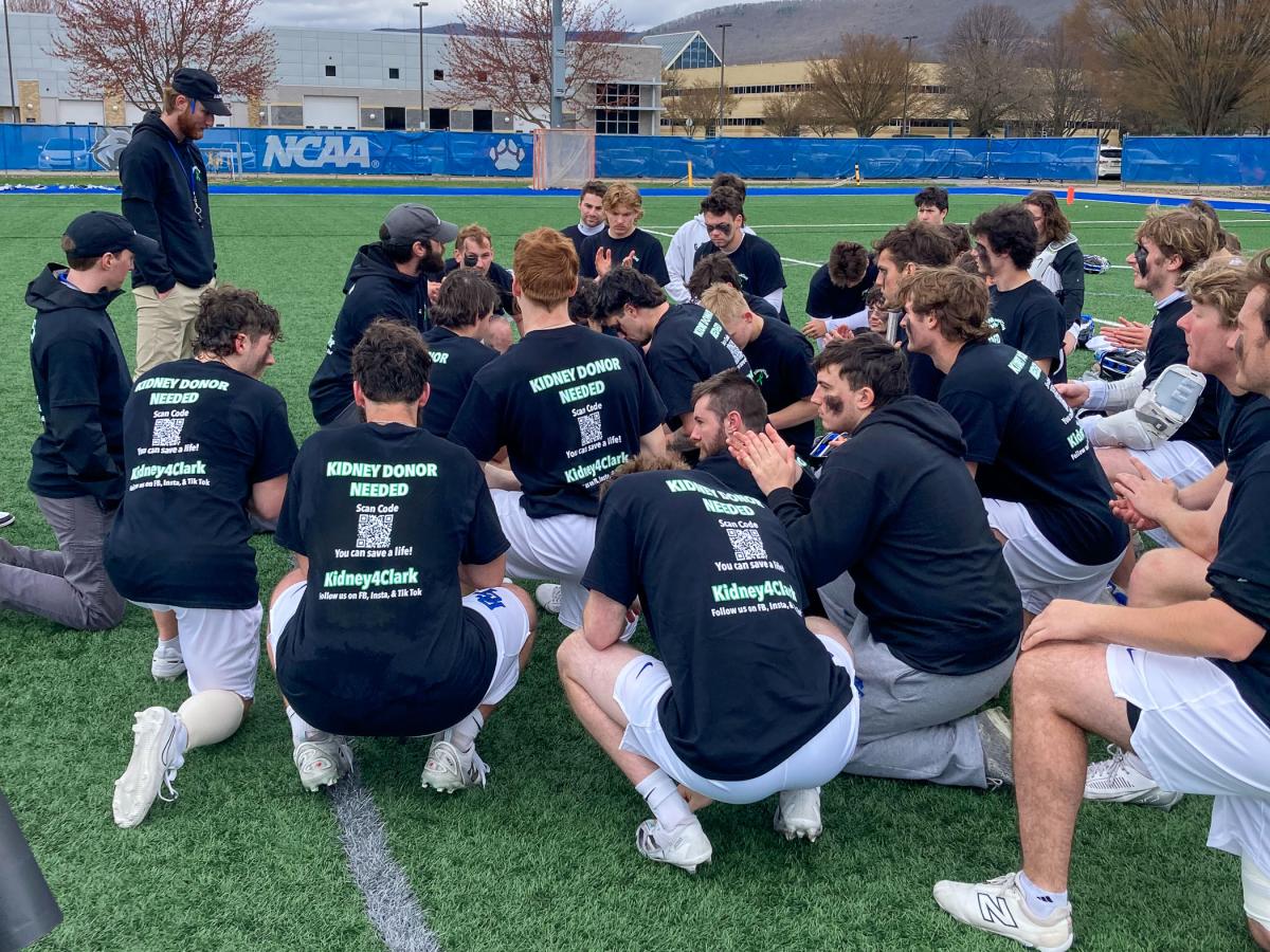 Jordan G. Williams, head coach of men’s lacrosse, explained: “Tim reached out to see if we would be interested in supporting Kidney 4 Clark after he heard about Clark and Lia Pitura. As anyone who has met Tim knows, he is one of the most kind and generous humans who is always looking for ways to serve others, so when he asked, we knew it was something we would be interested in doing. I brought it up to our leadership council and, without hesitation, they agreed it would be a great cause during one of our games to help raise visibility for Kidney 4 Clark and organ donation as a whole. Tim spearheaded the whole effort, purchasing T-shirts, organizing with the school and really making sure it was a visible event. We, as a program, are always looking for ways to serve, whether it be with hands-on volunteering, raising funds for causes or bringing awareness to causes.”