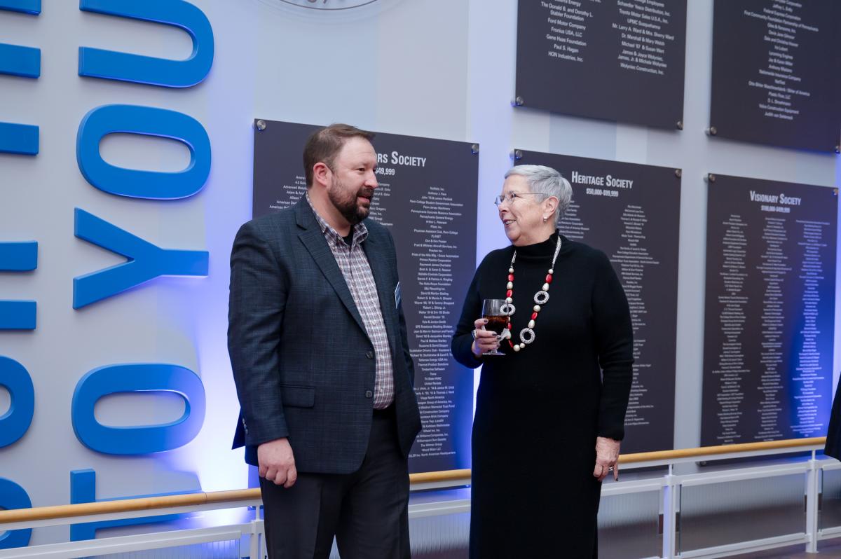 President Emeritus Davie Jane Gilmour (on right) converses with Justin W. Beishline, corporate relations officer. Gilmour is a new member of the Golden Society.