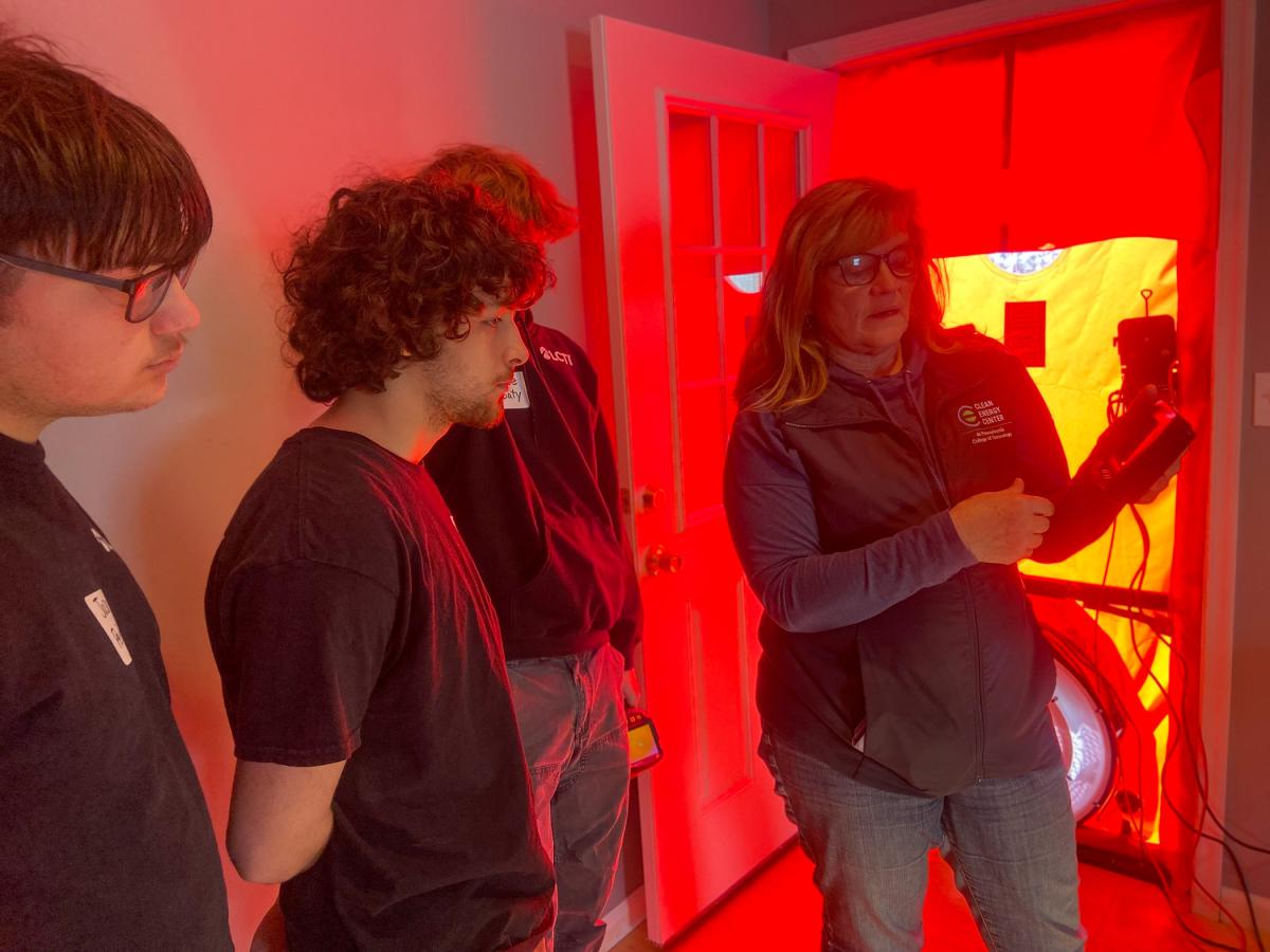 Dawn M. Snyder (right), building science trainer at Clean Energy Center's Harrisburg facility, works with Lehigh CTI students to perform a blower door test, which measures air leakage in a building.
