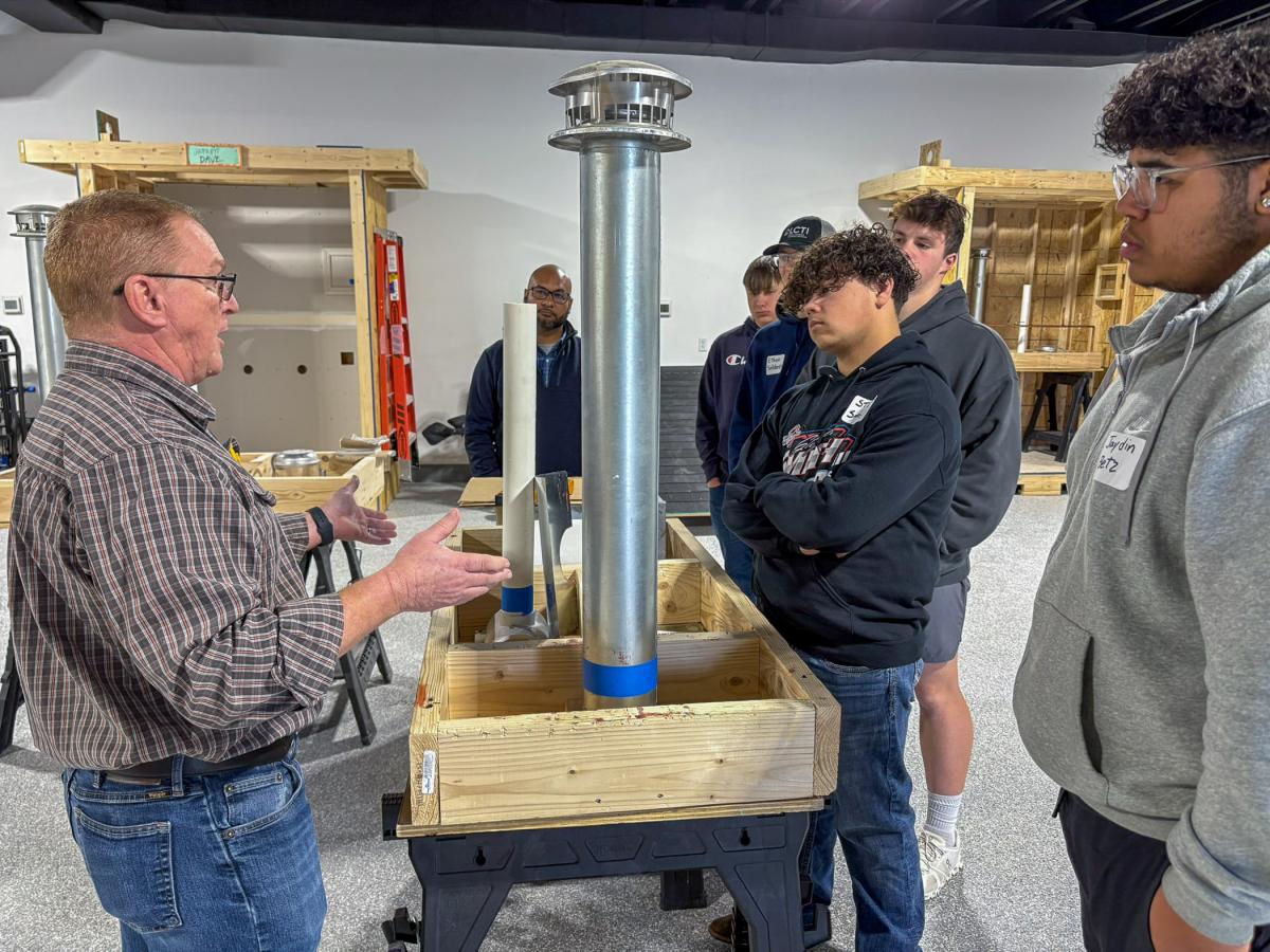 Rod S. Harman (left), HVAC and energy efficiency trainer at the Clean Energy Center's Harrisburg site, discusses the importance of applying fire caulking, as the Lehigh CTI visitors listen.