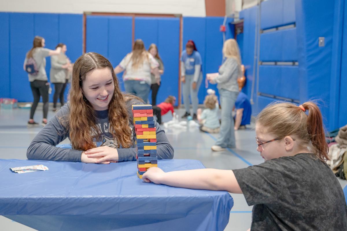 Catherine J. Lower (left), a student from State College, joins in on Jenga.