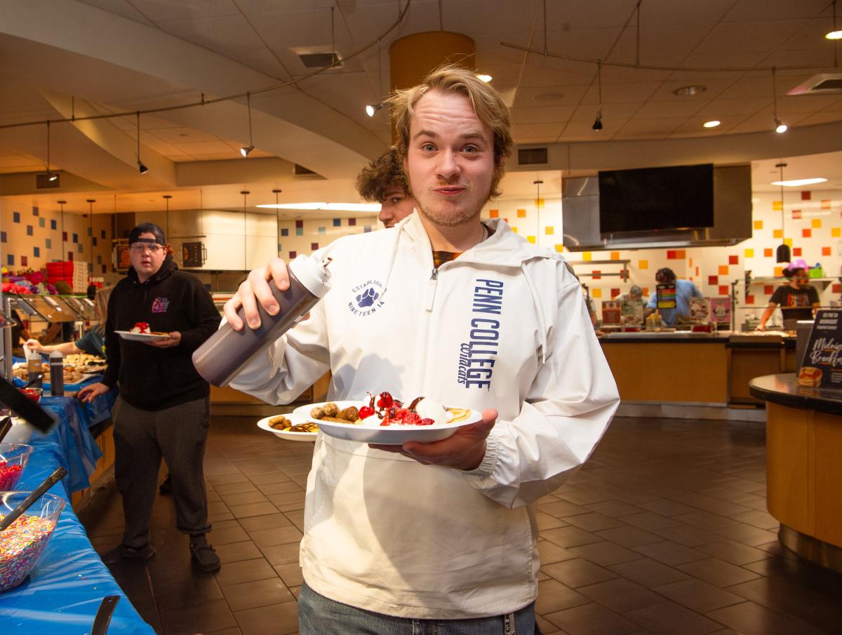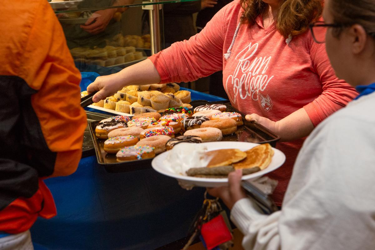 Thursday evening, 425 Penn College students braved intense rains to pile up stacks of pancakes, donuts, ice cream and other treats in Dauphin Hall’s Capitol Eatery. Hosted by Dining Services, the event also gave away a Kevita cruiser bike and some gift cards.